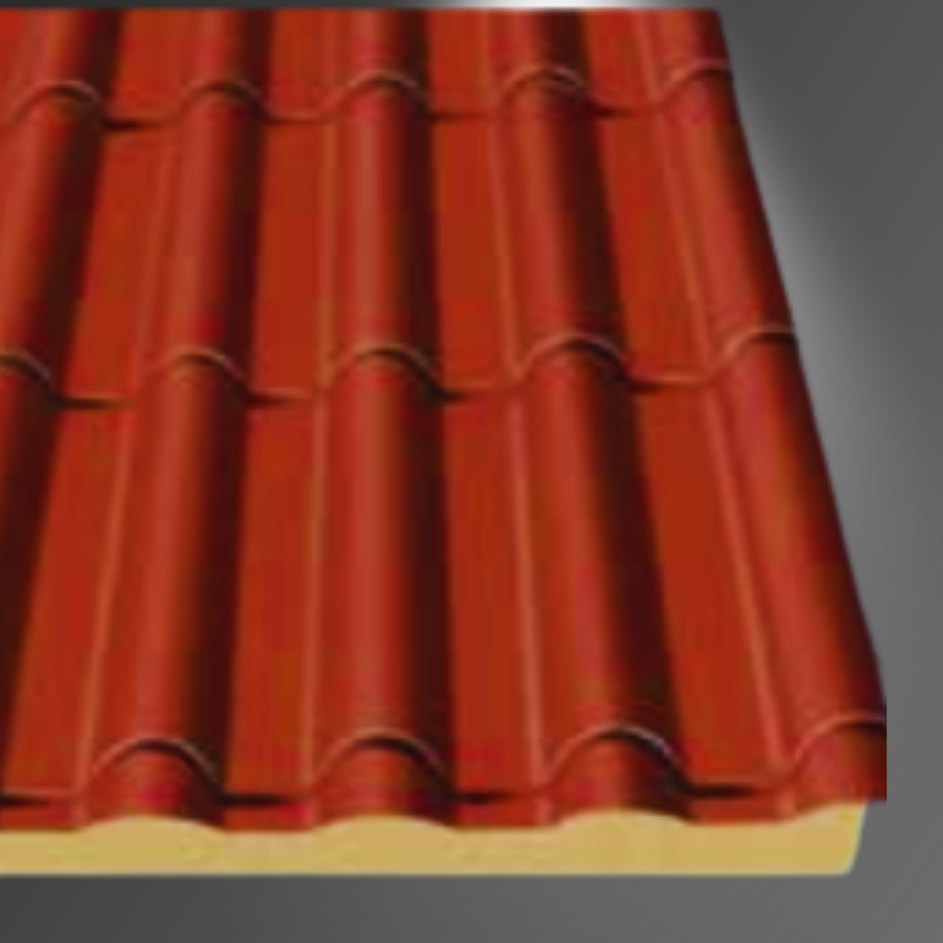 Panel aislado de perfil tipo teja, conformado por dos chapas de acero con núcleo de espuma de poliuretano (PUR) o poliisocianurato (PIR) inyectado en línea continua.